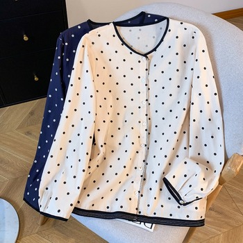 8963 # Loose Fit Polka Dot Print manga larga cuello redondo cárdigan abierto camisa para mujer otoño nueva llegada estilo Casual versátil